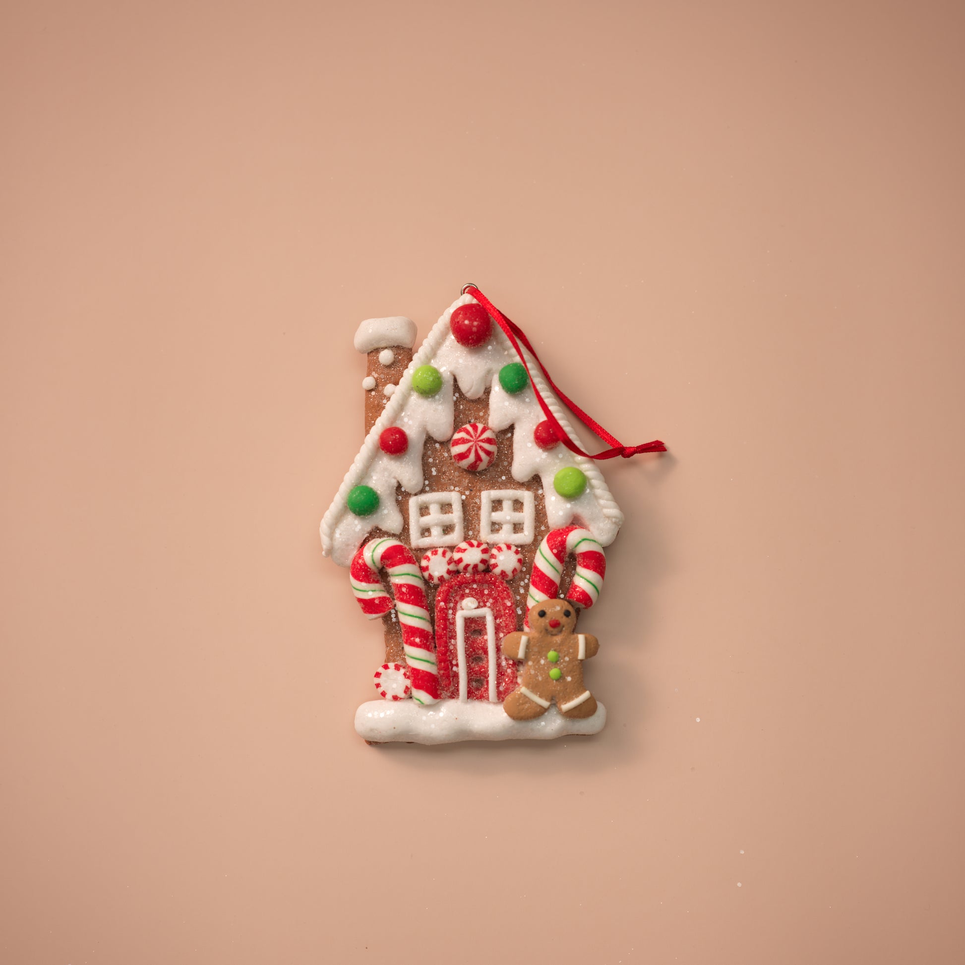 Add a whimsical candyland touch to your Christmas decor with this charming set of 3 flat gingerbread house ornaments. Each piece features colorful frosting details, peppermint swirls, candy canes, and a happy little gingerbread character at the door!