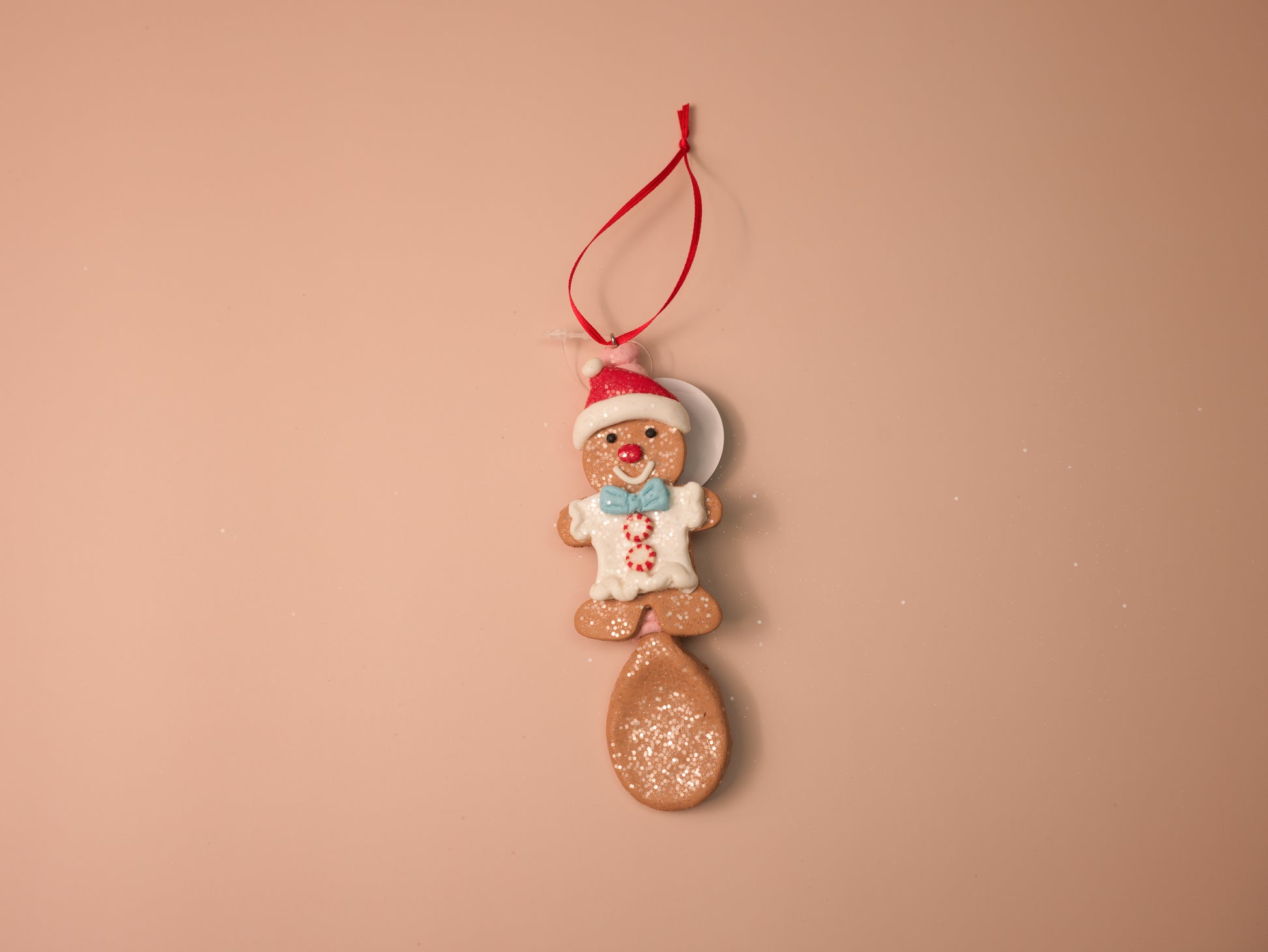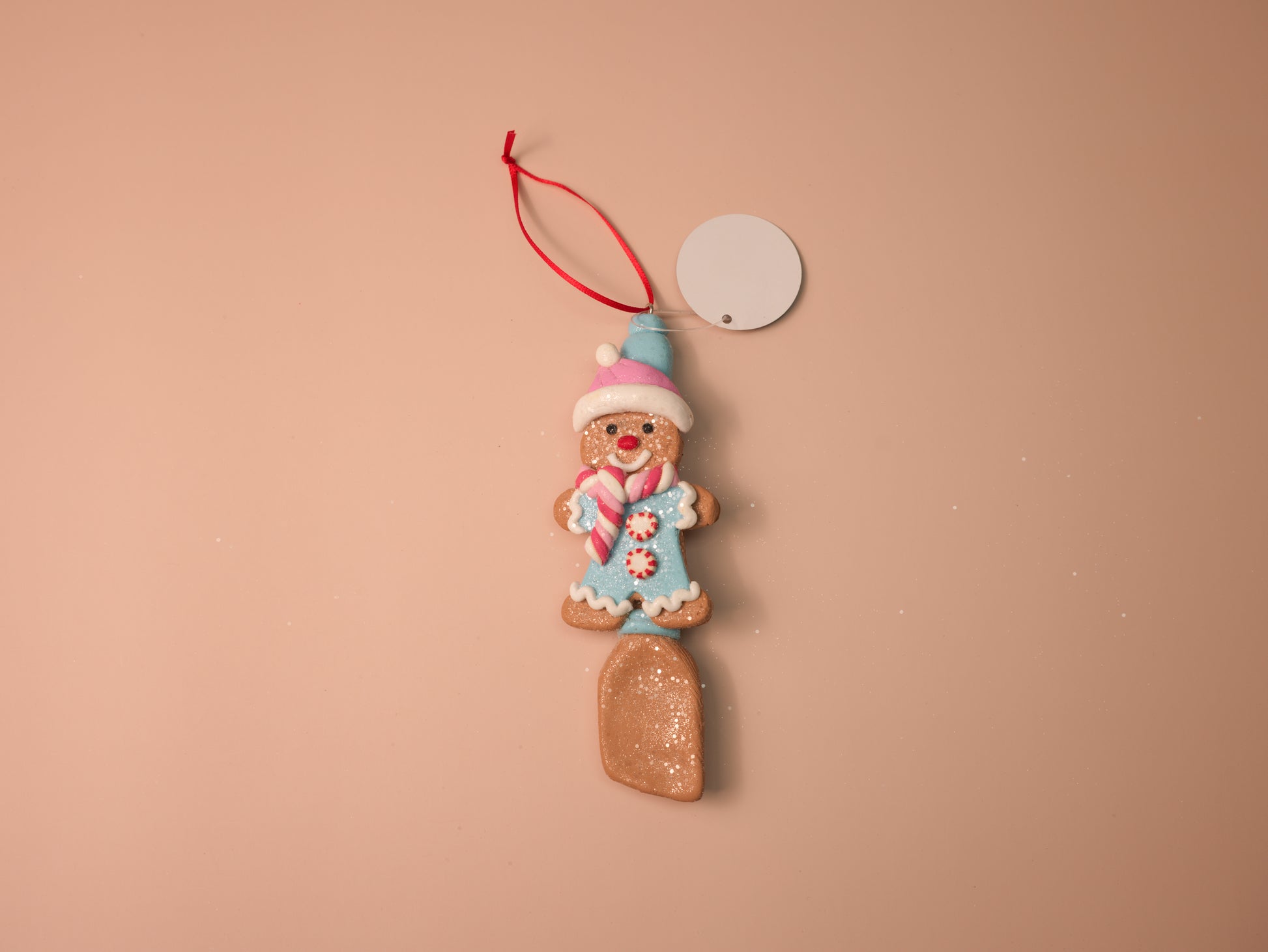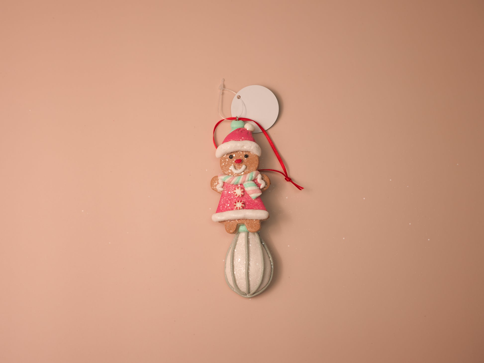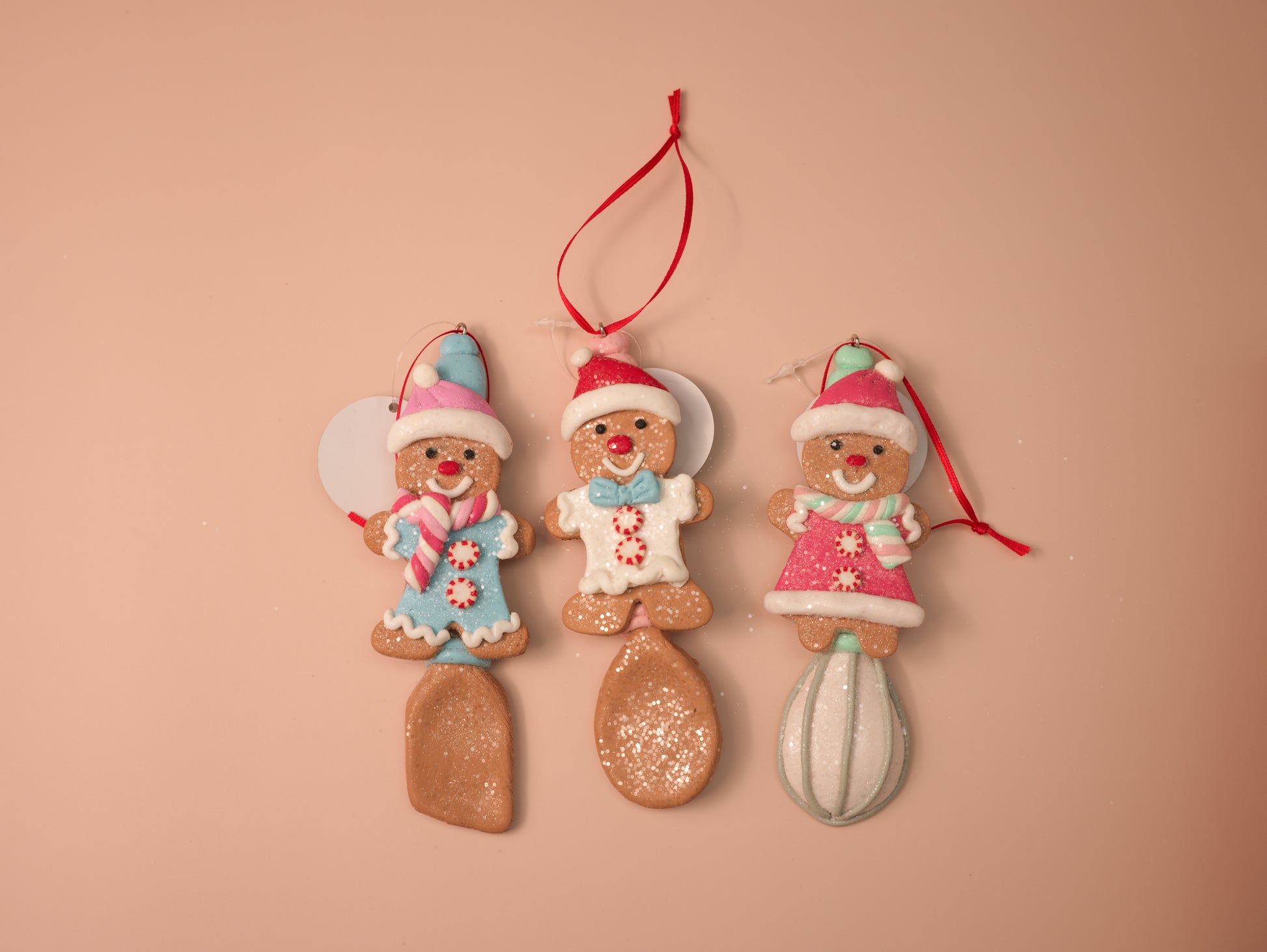 Whip up some holiday cheer with this adorable trio of kitchen-themed gingerbread ornaments. Each features a smiling gingerbread figure in festive attire, holding a different baking utensil: a spoon, a spatula, and a whisk, sprinkled with glitter for a frosted look. Perfect for food lovers and holiday bakers alike.