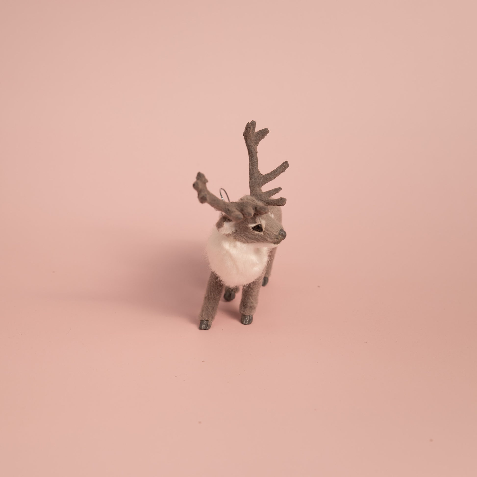 Crafted from soft faux fur and lightweight plastic, it perfectly captures the calm elegance of winter forests. Ideal for Christmas trees, wreaths, or mantel displays, this reindeer brings cozy woodland charm and festive spirit to any home.
