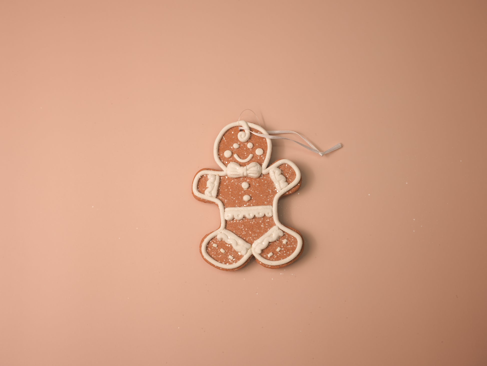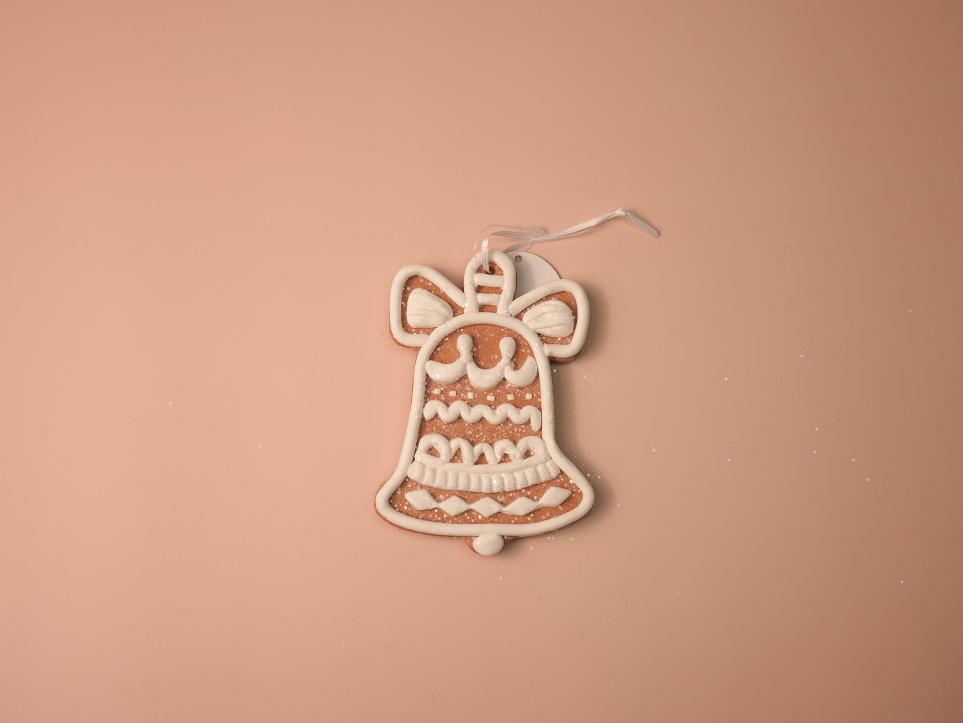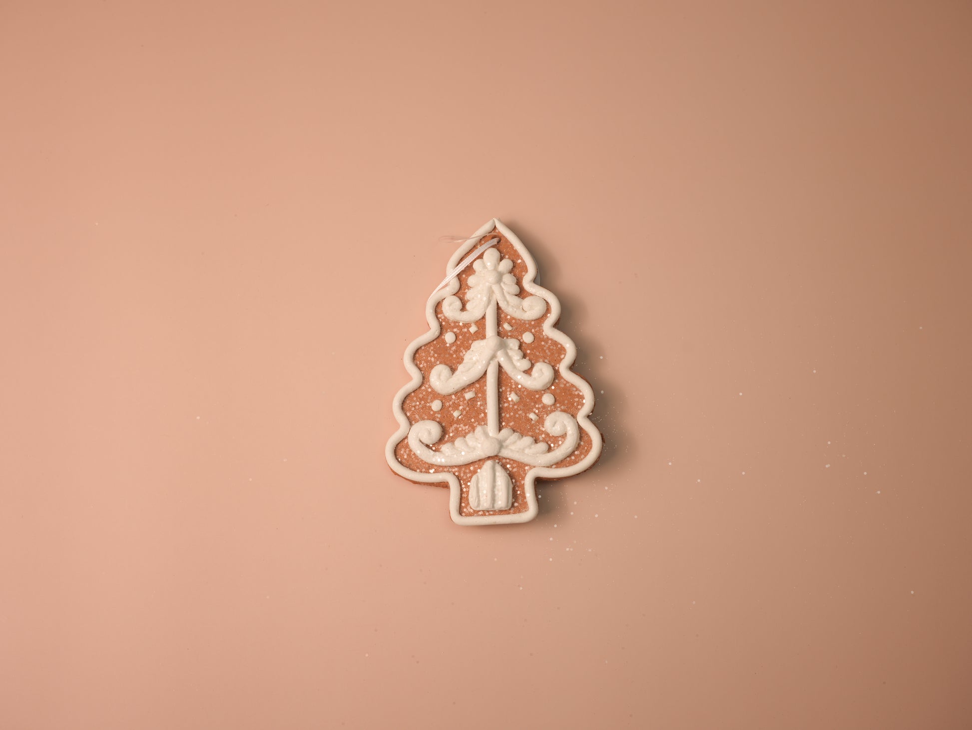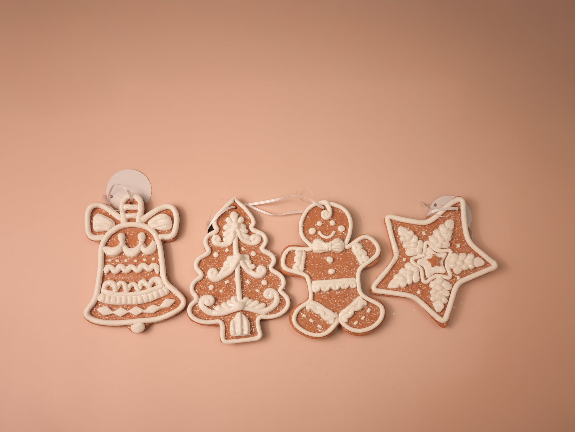 Add classic holiday charm to your décor with this set of white iced gingerbread ornaments. Featuring a festive bell, a Christmas tree, a smiling gingerbread man, and a snowflake star, each piece is decorated with intricate white icing details and a dusting of glitter for a frosted finish. Perfect for both traditional and whimsical Christmas themes.