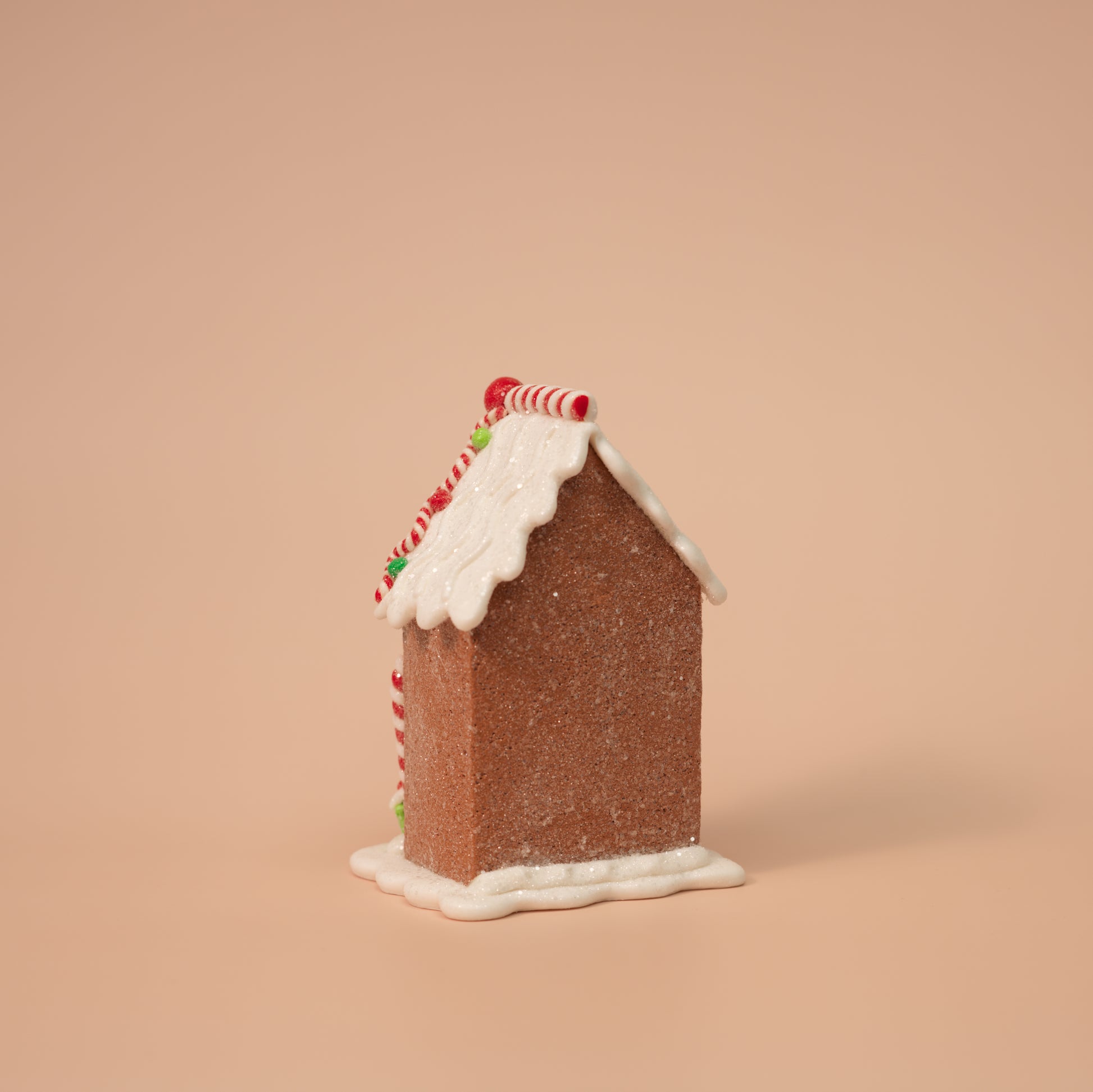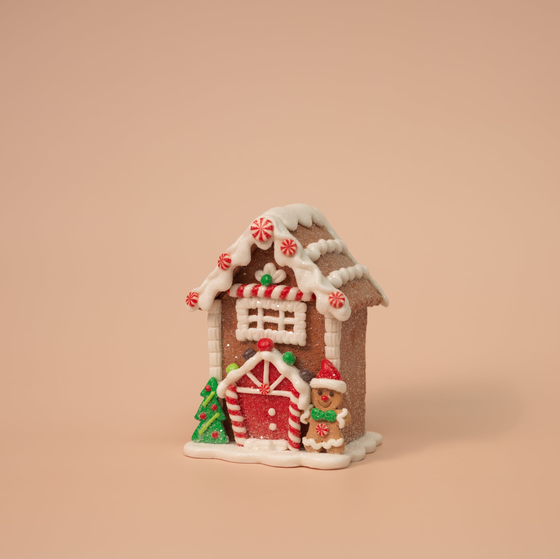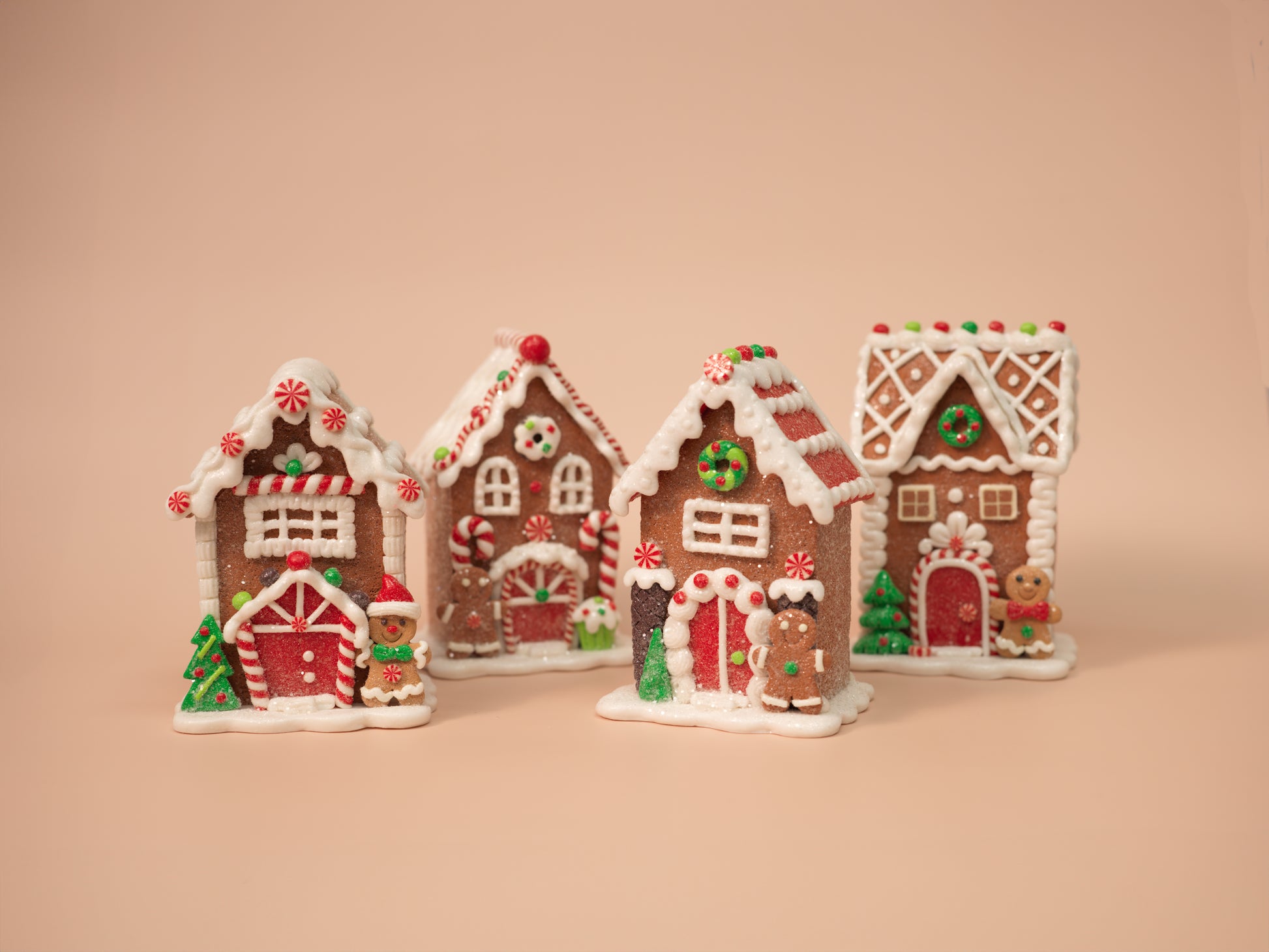 Create your own sweet holiday village with this 4-piece gingerbread house figurine set! Each house is uniquely decorated with candy details, festive characters, and snowy icing, perfect for shelves, tiered trays, or Christmas displays. Though they look good enough to eat, these charming clay dough figurines are built to last for seasons to come.