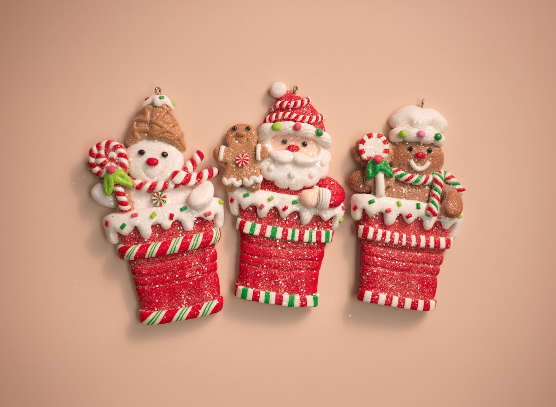 Add a festive sugar rush to your Christmas tree with these adorable sweet cup ornaments! Featuring a snowman, Santa Claus, and gingerbread chef, each peeks out of a candy-striped holiday cup topped with frosty icing and sparkly glitter.