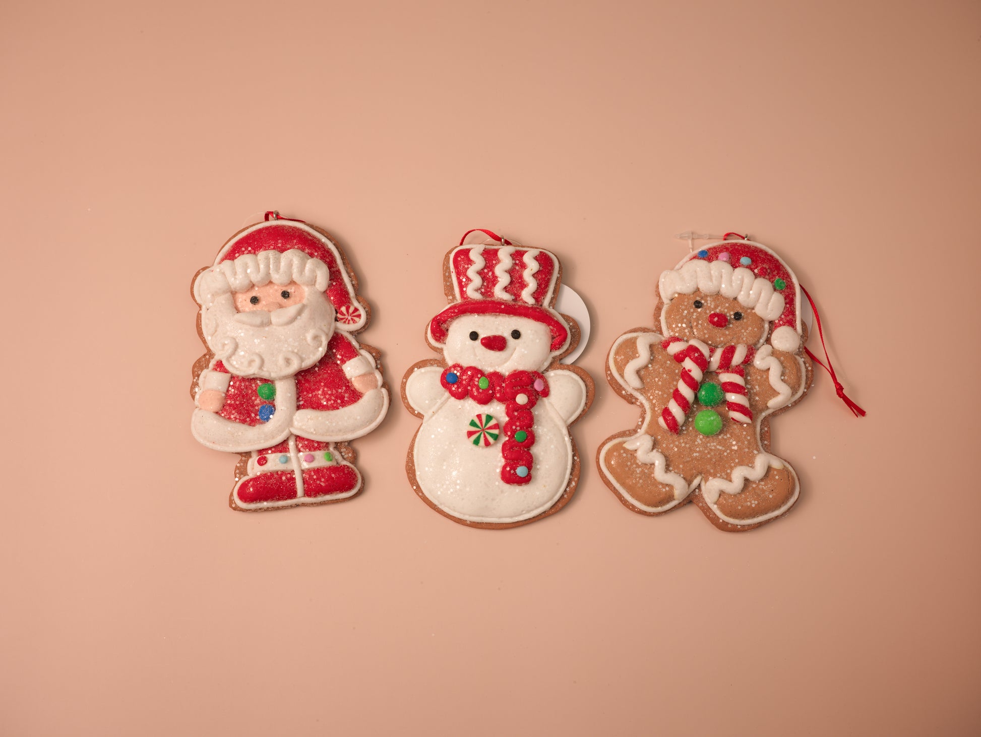 Bring festive cheer to your holiday décor with this delightful trio of Christmas character ornaments. The set includes a jolly Santa Claus in a red suit, a smiling snowman with a peppermint scarf and top hat, and a charming gingerbread man with candy cane details. Each piece is sprinkled with glitter for a sweet, frosted finish.