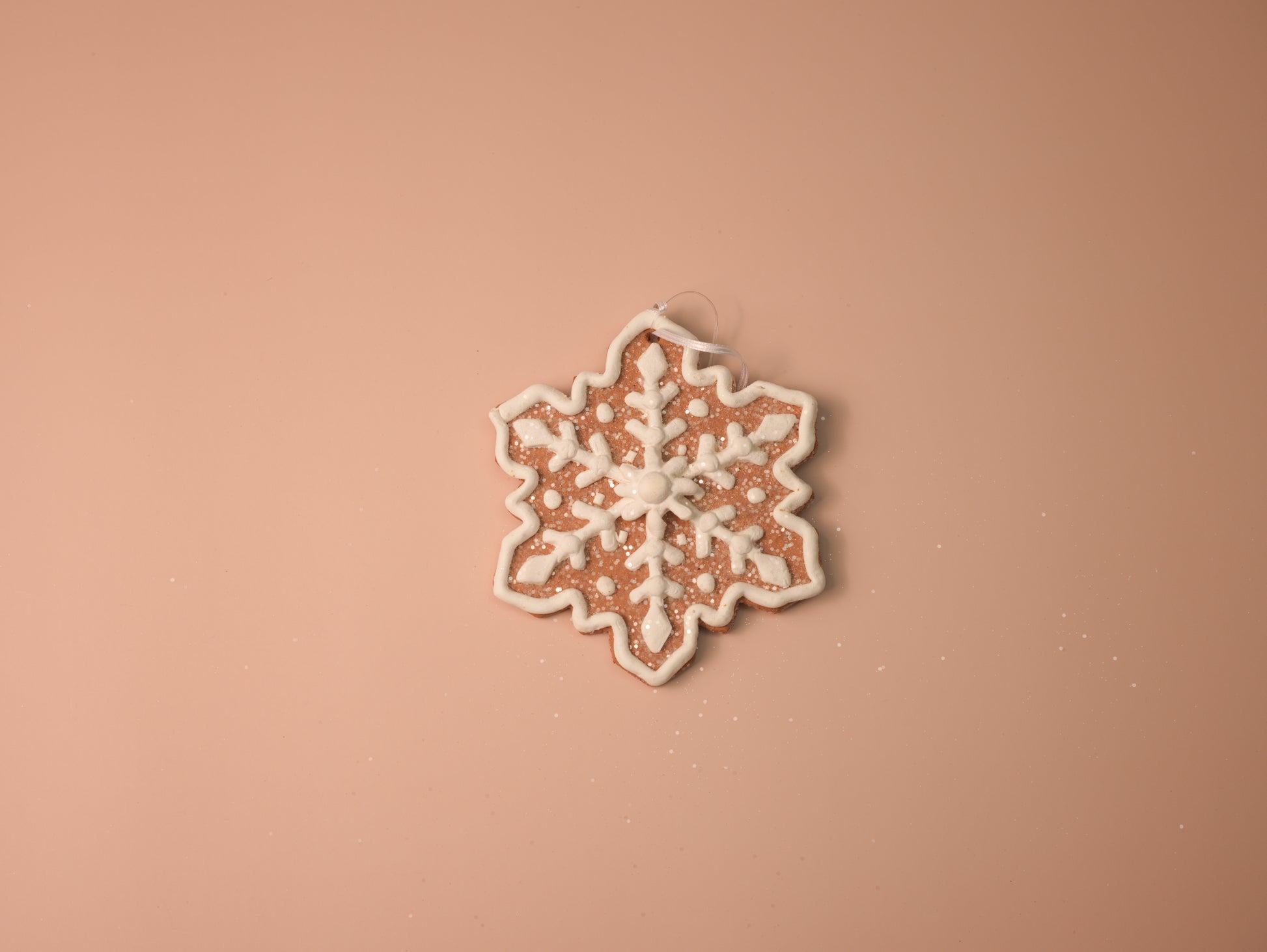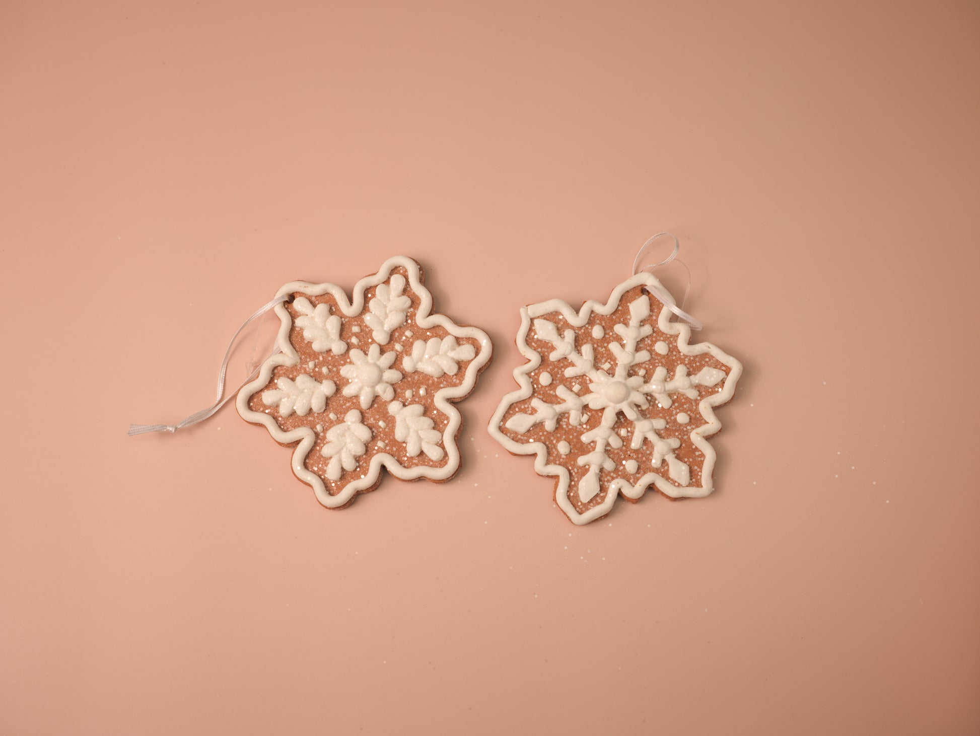 Bring a touch of frosted elegance to your holiday décor with this pair of white iced snowflake gingerbread ornaments. Each features intricate icing designs over a gingerbread base, finished with a dusting of glitter for a festive sparkle. Their classic look pairs beautifully with both traditional and whimsical Christmas themes.
